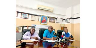 Tanzania Olympic Committee (TOC) Election Committee chairma, Ibrahi Mkwawa (centre) speaks on the commtee’s election scehduled for Sunday in Dar es Salaam. Left is Election commitee ecretary Abdulrahman Khamis Karume and TOC Secretary General Filbert Bayi. PHOTO | COURTESY