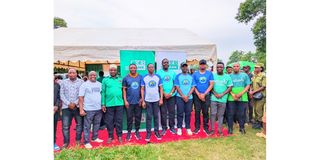 Minister of State in the President’s Office for Youth Development, Joel Nanauka (second left), and CRDB Bank Senior Manager for Youth Services, Mshindo Magimba, pose for a group photo with sports stakeholders from Mtwara Urban Constituency.