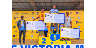 Winners of the Lake Victoria Half Marathon, Robert Makenzi (center) emerged as the first-place winner of the Lake Victoria Half Marathon, claiming a cash prize of Sh500,000, followed by John Joseph (right) in second place and Paul Makiya (left) in third. The race was organized to raise funds to support children born with cleft lips in Mwanza region. PHOTO | COURTESY