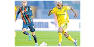 Young Africans (Yanga) attacking midfielder Pacome Zouzoua dribbles past an ASFAR player during their group match at Rabat Olympic Stadium, Morocco, on the night of Saturday, February 7. Yanga lost 1–0. PHOTO | COURTESY