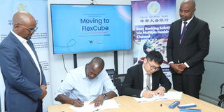 China Dasheng Chief Executive Officer Mr Xu Yueliang (seated right) and Wecodee Chief Executive Officer Mr Karthik Manoharan (seated left) sign system implementation contract documents for the bank’s digital transformation on Friday, January 23, 2026 in Dar es Salaam. Witnessing are The Head of ICT at China Dasheng Bank Mr Ramadhan Mbaga (standing left) and Head of Legal and Company Secretary Mr Ezra Nicholous (standing right).