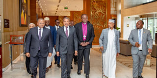 The former President of the United Republic of Tanzania, Dr Jakaya Kikwete, arrives at Johari Rotana Hotel in Dar es Salaam accompanied by the CRDB Bank Managing Director Mr Abdulmajid Nsekela (left), Mufti of Tanzania Sheikh Abubakari Zubeir (second right), Presiding Bishop of the Evangelical Lutheran Church in Tanzania (ELCT) Dr Alex Malasusa (centre) and Dar es Salaam Regional Commissioner Albert Chalamila (right), heading to the launch of CRDB Al Barakah Sukuk, the first Sharia-compliant bond.