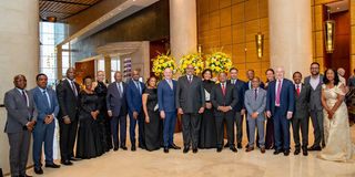 The Minister for Foreign Affairs and East African Cooperation, Ambassador Mahmoud Thabit Kombo (centre), in a group photo with the Chairperson of the Board of Directors of CRDB Bank, Prof. Neema Mori, the Group CEO of the CRDB Bank, Abdulmajid Nsekela, members of the CRDB Bank Board of Directors and its subsidiaries, as well as some investors during the official launch of the CRDB Bank Dubai Representative Office, held yesterday at the InterContinental Hotel in Dubai.