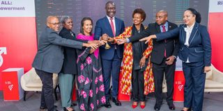 The Dar es Salaam Stock Exchange (DSE) Chief Executive Officer, Mr Peter Nalitolela (second right), and other distinguished leaders from different institutions jointly ring the bell for the Gender Equality event held in 2025 at the DSE headquarters.