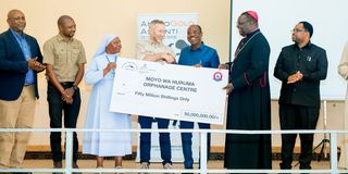 The Acting General Manager at GGML, Mr Duan Campbell (centre), hands over a commemorative Sh 50 million dummy cheque to the Geita Regional Commissioner, Mr Martine Shigela (third right) in the presence of Bishop Flavin Kasala of the Catholic Diocese of Geita, Sister Maria Lauda, Manager-Moyo wa Huruma Orphanage Centre and other representatives from the organisations supporting the orphanage.