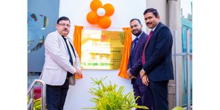 The Bank of Baroda Executive Director and the Bank of Baroda (Tanzania) Limited’s Board Chairman Mr Lal Singh (left), the Indian High Commission Chargé d’Affaires Mr Lakshay Anand (second right) and the Bank of Baroda (Tanzania) Limited’s Managing Director Mr Palanivell S K (right) pictured in front of the inaugural plaque of the newly opened Upanga branch.