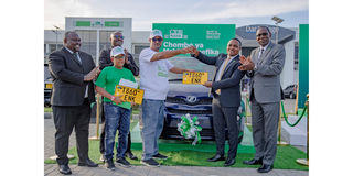 The Head of Consumer Banking at CRDB Bank, Stephen Adili (second from right), handing over the key and registration number of an IST car to Fahad Soud Hilal (from Tanga) after emerging as the second prize winner in the “Bank is SimBanking” campaign. Others in the photo are CRDB Bank Eastern Zone Manager, Badru Idd (far right), CRDB Bank Eastern Zone Business Manager, Elikira Nkya (far left), Hilal’s child, and CRDB Bank Dar Village Branch Manager, Isaya Lyimo (second from right).