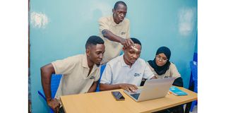 The founders of Digital Agency, Ramadhani Karupa (left, seated) and Hamza Ali Nasoro (centre, seated), engaged in a discussion about client projects at their office located in Tanga Digital Hub.
