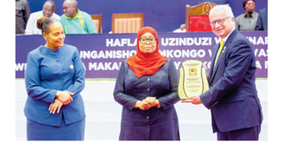 President of the United Republic of Tanzania Dr Samia Suluhu Hassan poses for a group photo with Chief Executive Officer of Yas Tanzania and Chairman of the Consortium of Telcom Operators Pierre Canton Bacara (right) during the appreciation award handover ceremony, marking the completion of communication towers and the national fibre optic backbone infrastructure at the Jakaya Kikwete Convention Centre in Dodoma. Left is Minister for Information, Telecommunication and Information Technology, Ms Angella Kairuki.