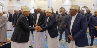 Zanzibar President Hussein Mwinyi greets former First Vice President Othman Masoud at a mosque in Zanzibar during the national Eid prayers held in Unguja. PHOTO | JESSE MIKOFU