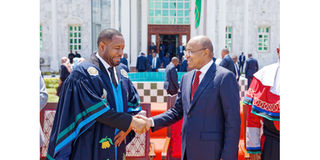 Zanzibar President Dr Hussein Mwinyi (right) shakes hands with Zuebeir Ali Maulid, Speaker of the Zanzibar House of Representatives, upon arriving for the launch of the House in Unguja yesterday. PHOTO |JESSE MBEZI