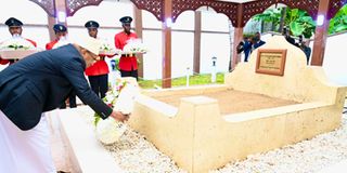 Zanzibar President Hussein Ali Mwinyi lays a wreath at the grave of the first president and Revolutionary Council chairman, Sheikh Abeid Amani Karume, after prayers at the CCM Kisiwandui sub-office to mark Karume Day in Unguja on Tuesday, April 7, 2025. PHOTO | STATE HOUSE