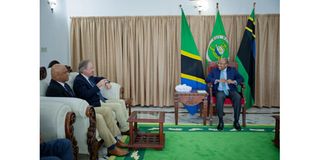 Dr Mwinyi during talks with the Chairperson of the Commonwealth Enterprise and Investment Council, Lord Swire, who led a delegation to State House in Zanzibar.