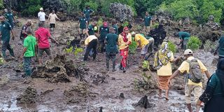 Residents and staff of the Ministry of Agriculture, Irrigation, Natural Resources, and Livestock planting mangrove trees along the coast of Muyuni Shehia in the Southern District of South Unguja Region, as part of World Tree Planting Day celebrations. Approximately 2,500 mangroves were planted in the area, which previously had mangroves but were cut down due to various human activities. PHOTO | JESSE MIKOFU
