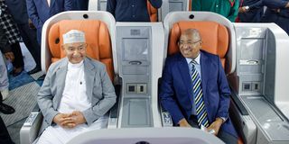 Zanzibar President Hussein Mwinyi listens to briefing from Minister Shariff Ali during launch of Azam Kilimanjaro 9 boat in Mtoni, Unguja. PHOTO | JESSE MIKOFU
