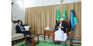 President of Zanzibar Dr Hussein Ali Mwinyi in talks with AKDN representative Mr Amin Mawji at Zanzibar State House.