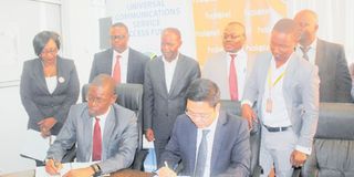 Universal Communications Service Access Fund managing director Peter Ulanga and Halotel Tanzania managing director Le Van Dai ink a deal in Dar es Salaam on building 47 towers to improve communication in rural areas last year. Witnessing the signing are minister Makame Mbarawa (third left standing) and senior officials. PHOTO | FILE