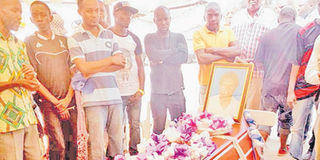 Mourners and relatives pray before the coffin carrying the body of Stanislaus Mayaya during a burial service at Kimara Stop Over in Dar es Salaam on Friday. Mayaya died after having taken illicit brew allegedly carrying chemicals unfit for human consumption. PHOTO | cITIZEN CORRESPONDENT