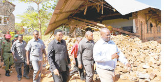 Prime Minister Kassim Majaliwa (fourth right) assesses the damage at Ihungo Secondary School following the earthquake that hit Bukoba and its environs on September 10. The school was closed and will be rebuilt after it was severely damaged in the earthquake. PHOTO | FILE