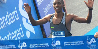 Tanzania's long distance runner Alphonce Simbu crosses the finish line during the 2017 Mumbai Marathon. The 25-year old competes at the London Marathon today.
