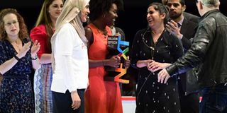 Ubongo chief business officer Doreen Kessy (middle) is all smiles after her organisation emerged winner in a global tech competition for education. She is flanked by top three finalists to receive the award at a ceremony held in Dubai early in the week. PHOTO | COURTESY
