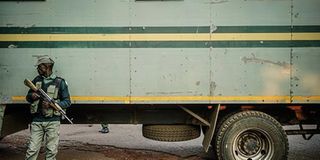 A supporter of the opposition Movement for Democratic Change (MDC) Alliance gestures the party's symbol from inside of a prison truck following their appearance at the magistrate's court in Harare, on August 6, 2018 after many MDC supporters were arrested following a post election violence. Twenty seven members of the MDC opposition appeared in court on violence charges after the protests against alleged cheating by President Emmerson Mnangagwa and the ruling ZANU-PF party in the election. Since the knife-edge election result was declared, the MDC say they have been the target of a brutal crackdown that exposes Mnangagwa's claims to respect rights and halt repression.