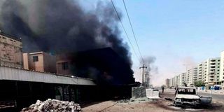 Smoke rises from a building next to a damaged car on a street in Khartoum, Sudan. The conflict in Sudan, now in its seventh month, is fast becoming a famine crisis.