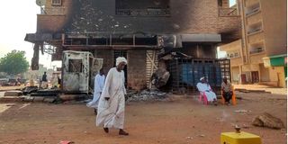 Men walk past others sitting outside a burnt-down bank branch in southern Khartoum on May 24, 2023.