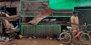 A man stands with a bicycle by a medical centre building riddled with bullet holes at the Souk Sitta (Market Six) in the south of Khartoum on June 1, 2023.