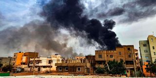 Smoke plumes billow from a fire at a lumber warehouse in southern Khartoum amidst ongoing fighting on June 7, 2023.