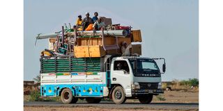 People ride with furniture and other items atop a truck moving along a road from Khartoum to Wad Madani at the locality of Kamlin, about 80 kilometres southeast of Khartoum, on June 22, 2023.