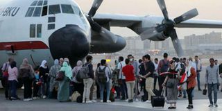 A handout picture released by the Egyptian Army on April 24, 2023, shows Egyptian evacuees from Sudan disembarking upon landing in Cairo. - Multiple nations have scrambled to evacuate embassy staff and citizens by road, air and sea from chaos-torn Sudan, where fighting between the army and paramilitaries has killed hundreds.