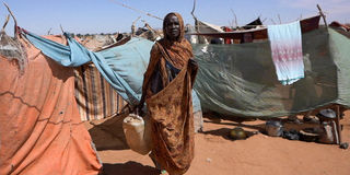 Awadeya, a Sudanese displaced woman who was held by the paramilitary Rapid Support Forces, carries a water container at a camp for displaced people who fled from al-Fashir to Tawila, North Darfur, Sudan, November 15, 2025.