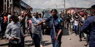 Congolese police on June 17, 2022 escort a convoy transporting the body of a DRC soldier who was shot and killed by Rwandan forces at Rubavu border post. Another soldier was killed at the same place on November 19, 2022.
