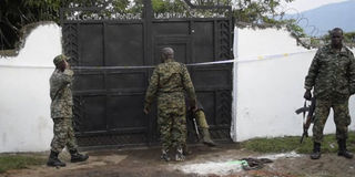 Uganda security forces are seen standing at the premises of an attack in Mpondwe, Uganda, on June 17, 2023, at the Mpondwe Lhubiriha Secondary School.