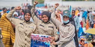 Somali Police officers hold a banner with a quote from Somalia's President Hassan Sheikh Mohamud during a demonstration in support of Somalia's government following the port deal signed between Ethiopia and the breakaway region of Somaliland at Eng Yariisow Stadium in Mogadishu on January 3, 2024.