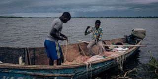Teenagers prepare fishing nets in the port of Vitshumbi before heading out to fish on Lake Edward in eastern Democratic Republic of Congo (DRC) on April 3, 2023. PHOTO | ALEXIS HUGUET | AFP