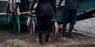 Men take fish out of a canoe after returning from fishing in the port of Vitshumbi on Lake Edward in eastern Democratic Republic of Congo (DRC) on April 3, 2023. PHOTO | ALEXIS HUGUET | AFP