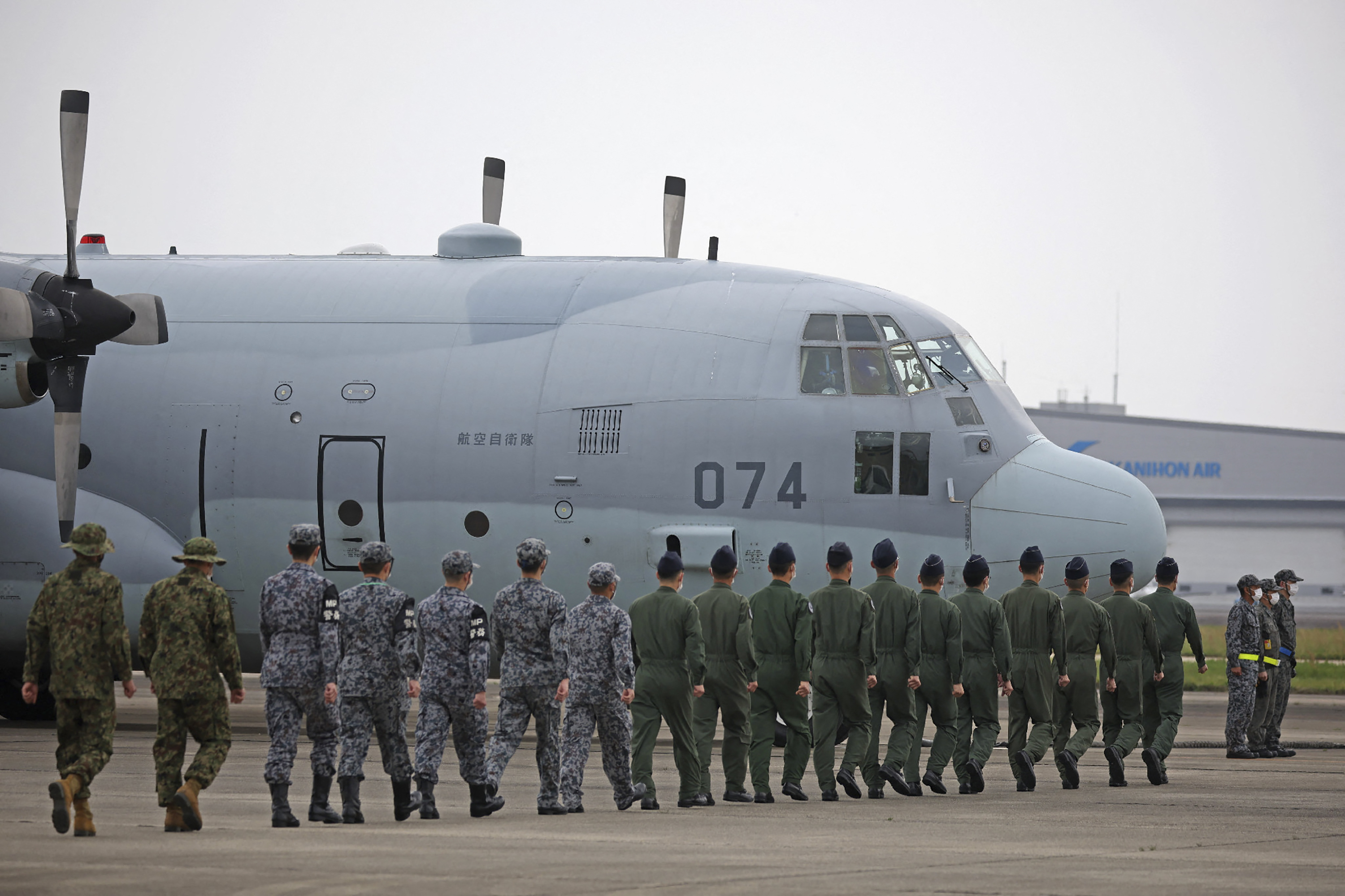 Self-Defense Force personnel board an Air Self-Defense Force C-130 transport plane before departing to Djibouti in preparation for the evacuation of Japanese nationals from Sudan, at Komaki Air Base, Aichi prefecture on April 21, 2023.