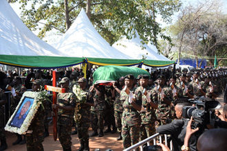Tanzania Peoples Defence Forces soldiers carrying the coffin containing the body of ex-President Benjamin Mkapa to the cemetery area for the funeral held in Lupaso Village in Mtwara Region.