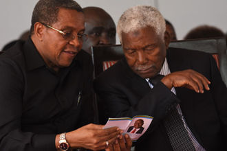 Retired presidents Jakaya Kikwete and Ali Hassan Mwinyi reads the funeral programme for their late counterpart Benjamin Mkapa during his burial at Lupaso village.