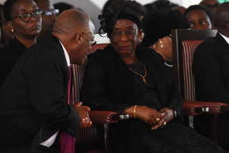 President John Magufuli shares a word with widowed Anna Mkapa at the funeral of the late President Benjamin Mkapa in Lupaso village.