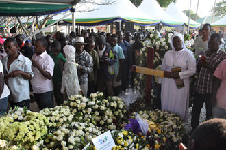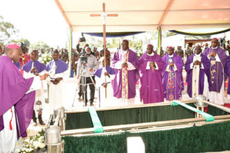 Tunduru Diocese Catholic Bishop Filbert Mhasi leading the funeral service for the late former President Benjamin Mkapa who was buried at Lupaso village in Masasi District following his death in Dar es Salaam on July 23, 2020