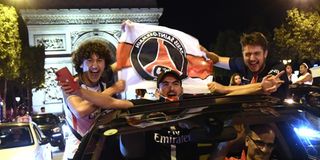Paris Saint-Germain supporters wave the club flags as they celebrate on the Champs Elysee Avenue after their team's 3-0 win over RB Leipzig in Paris on August 18, 2020 following the UEFA Champions League semi-final football match between Leipzig and Paris Saint-Germain, played in Lisbon.