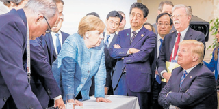 The president’s outbursts turned the summit into the G-6 vs. G-1. The mood was captured in an already iconic photograph showing Trump sitting, his arms crossed in a defensive posture, while German Chancellor Angela Merkel, surrounded by the other leaders, leans across the table at him. Trump looks like a defendant who has just been found guilty by a jury of his peers.
