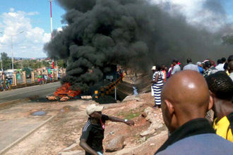 PROTEST: Residents of the Tanzania-Kenya border town of Namanga look at a blaze following a fire that was on Monday lit on the road by demonstrators, who were enraged by the deportation of Kenyans, who were allegedly living and working in Tanzania without valid permits. PHOTO | THE CITIZEN