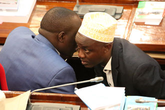 Minerals minister Doto Biteko and Geita Rural’s Joseph Msukuma consulting one another today in Parliament. PHOTO |ERICKY BONIFACE.