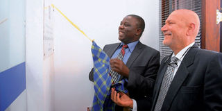 Arusha Regional Commissioner Magesa Mulongo pulls down the curtain to officially inaugurate the Exim Bank Corporate Centre in Arusha at the weekend. Looking on is Exim Bank Tanzania Board chairman Yogesh Manek. PHOTO|CITIZEN CORRESPONDENT