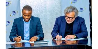 The Director General of TPA, Mr. Plasduce Mbossa (left), and the President of Africa Global Logistics (AGL) Ltd, Mr. Philippe Labonne (right), sign a Memorandum of Understanding (MoU) for cooperation on the design and construction of three new berths at Bagamoyo Port on 6 December 2025, at TPA Headquarters in Dar es Salaam.