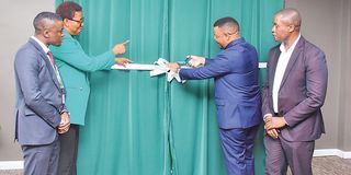 The Bank of Africa – Tanzania managing director Adam Mihayo (right) cuts a ribbon during the launch of the bank’s agent banking services in Dar es Salaam yesterday. With him is the bank’s senior head of marketing and communication Nandi Mwiyombella (left), head of digital services Jesse Jackson (second left). PHOTO | THE CITIZEN CORRESPONDENT